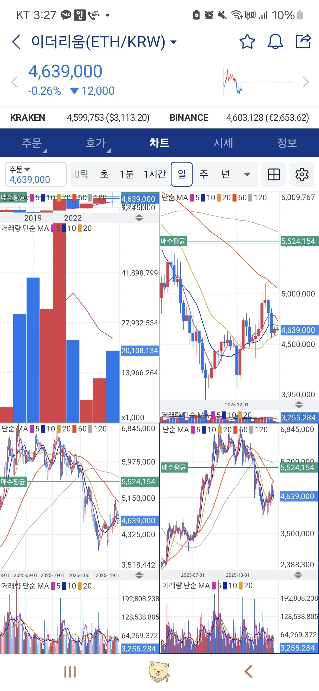저는 비트코인 외, 알트 코인으로 이더리움을 보유중입니다. 이더리움은 일단 반등이 많이 없어서 -15.93%를 기록하고 있습니다. 떨어졌다고 너무 성급하게 매입을 한 것인지. 초창기 수업 듣기 전부터 보유중이였으며, 현재는 차트를 열심히 분석해서 물을 탄게 15.93%입니다. 처음에 실수를 한 만큼 시간이 날 때마다 차트를 성실하게 분석해서 반드시 익절로 마무리해보고자 합니다. 저만의 첫번째 숙제로 남겨두고 있습니다.