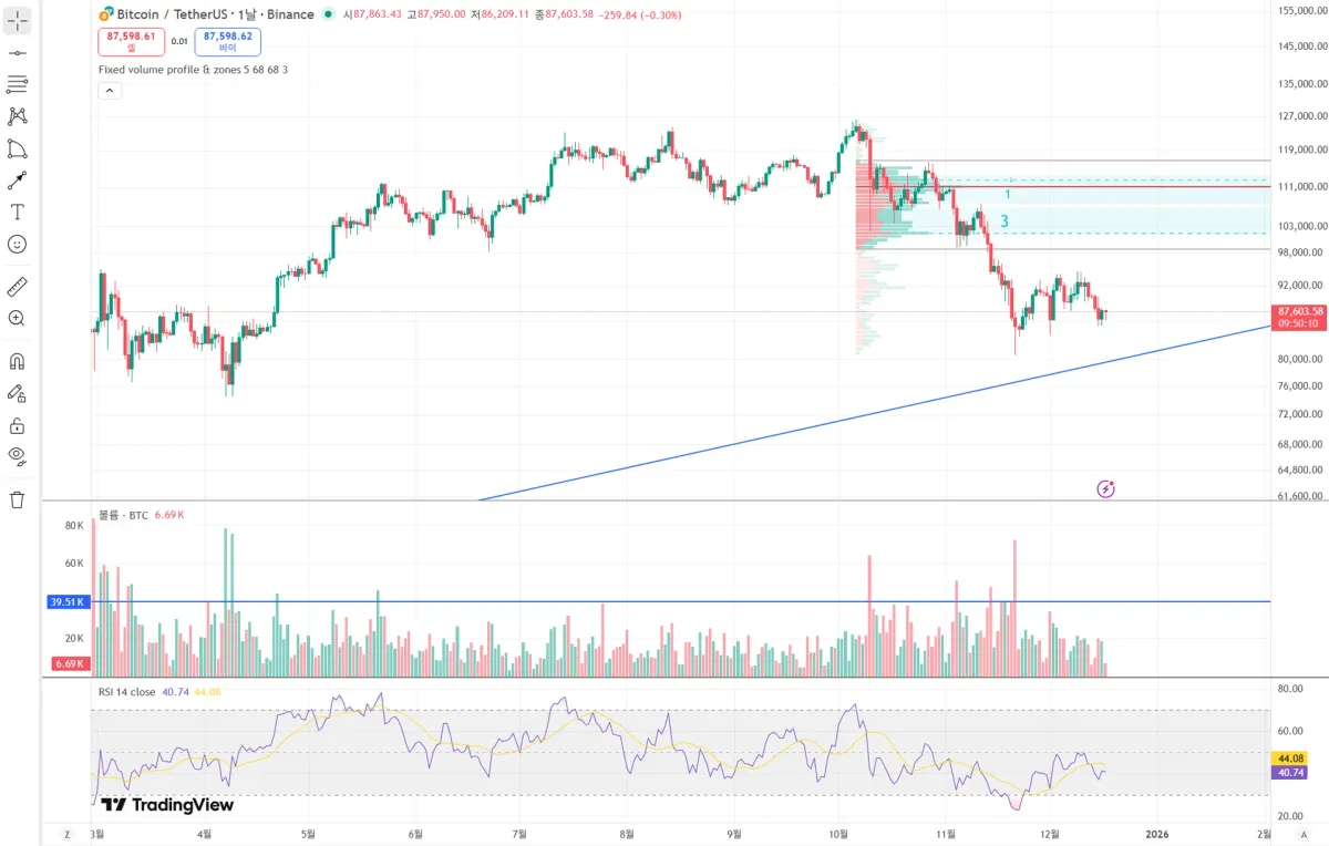 거래량/RSI/FIXED RANGE VOLUME PROFILE 보조지표를 추가해둔 상태입니다.