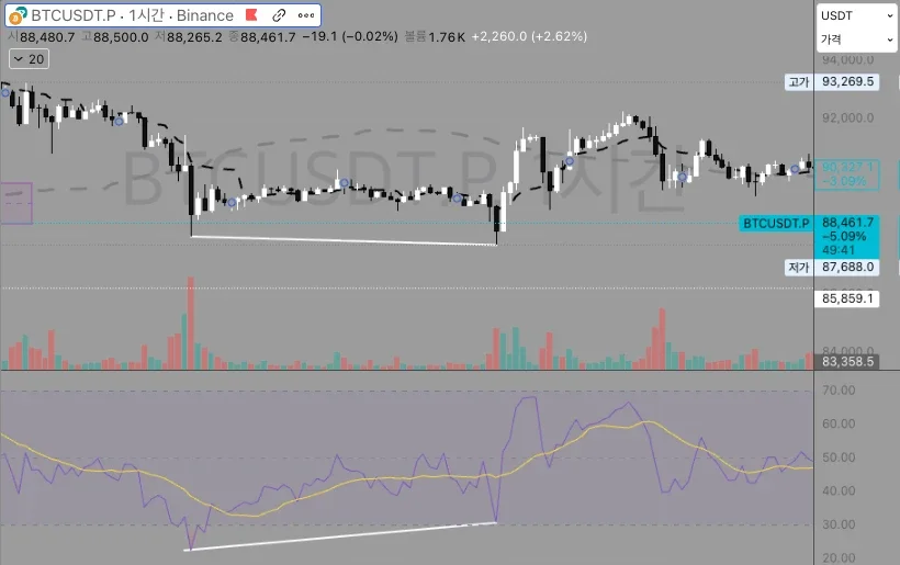 BTC 1시간 봉에서 RSI 다이버전스 구간 체크했습니다.