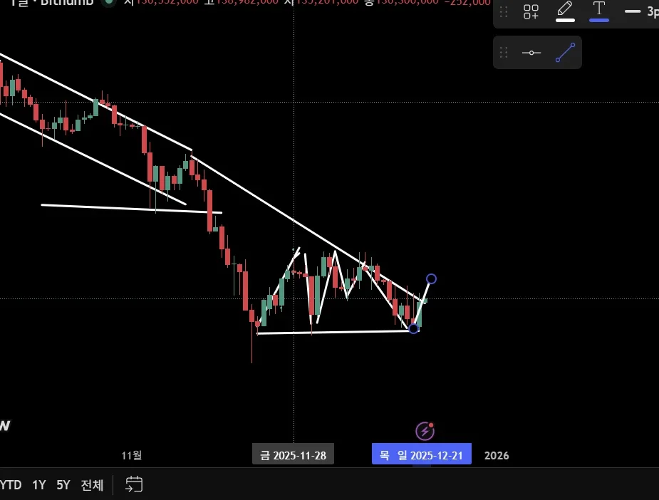 - 현재 차트상 웻지 패턴 작도가 가능하므로, 마지막 저항선을 뚫는다면 웻지패턴 실행될 것으로 예상됨.