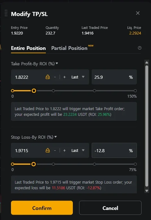추세선을 돌파하면 손절, 이에 맞추어 손익비 1:2로 잡아 수익 구간을 판단, 손실 퍼센트는 약 2.6%