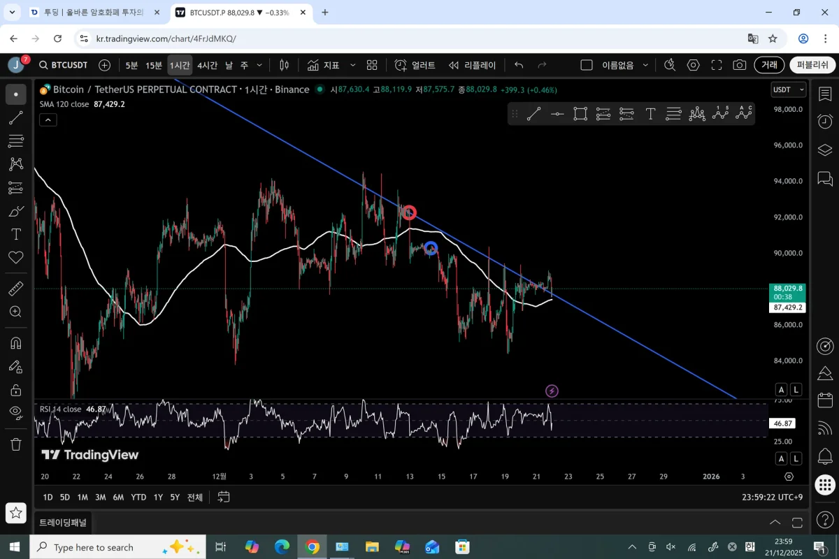 계속 이어져오던 저항선을 맞았고, rsi 상으로도 히든 다이버전스가 나타나고 있어서, 하락 가능성이 높다고 판단하여 숏 포지션에 진입하여 수익을 만들어냈습니다.