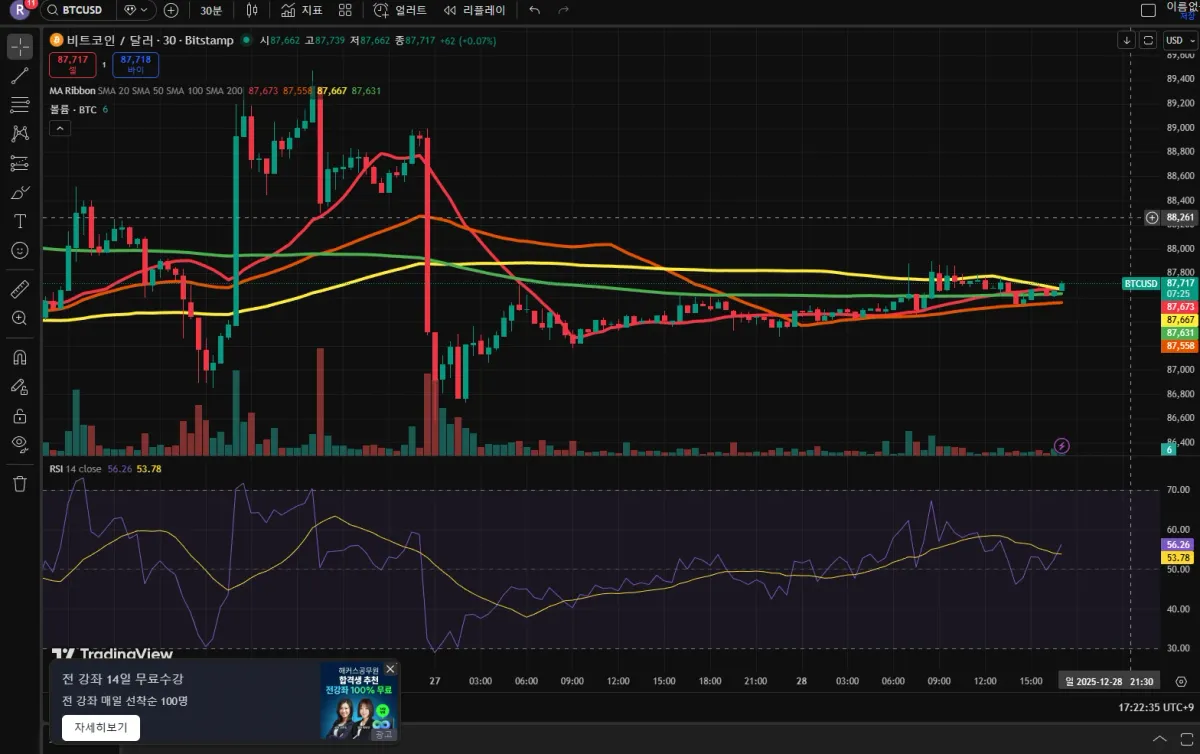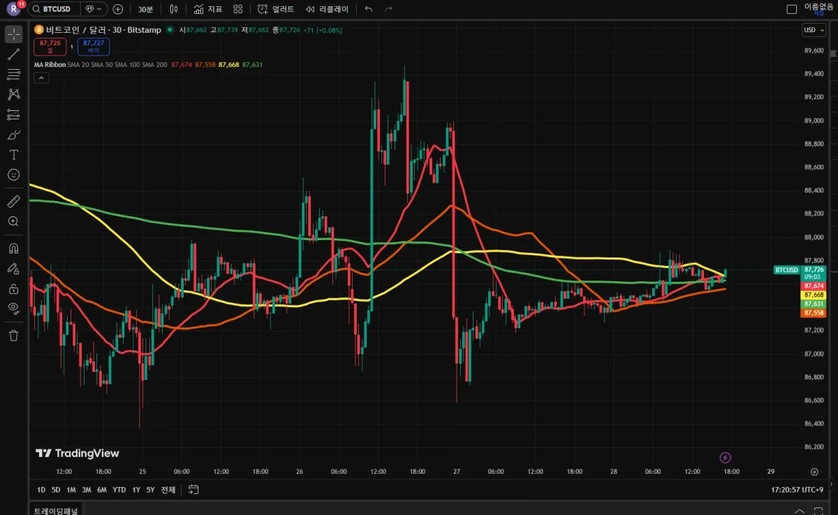 현재 비트코인 추세는 볼린저 밴드를 좁히면서 횡보 하고 있는 추세라서 모의 투자를 하려면 데이트레이드 단타를 하기로 결정함