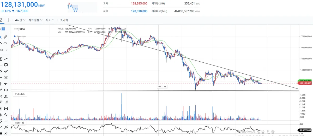 추세선 상 하단의 지지라인에 근접, 가격 하락은 지속적으로 이어지고있지만, 거래량이 감소하여 하락 다이버전스 구조가 보임.