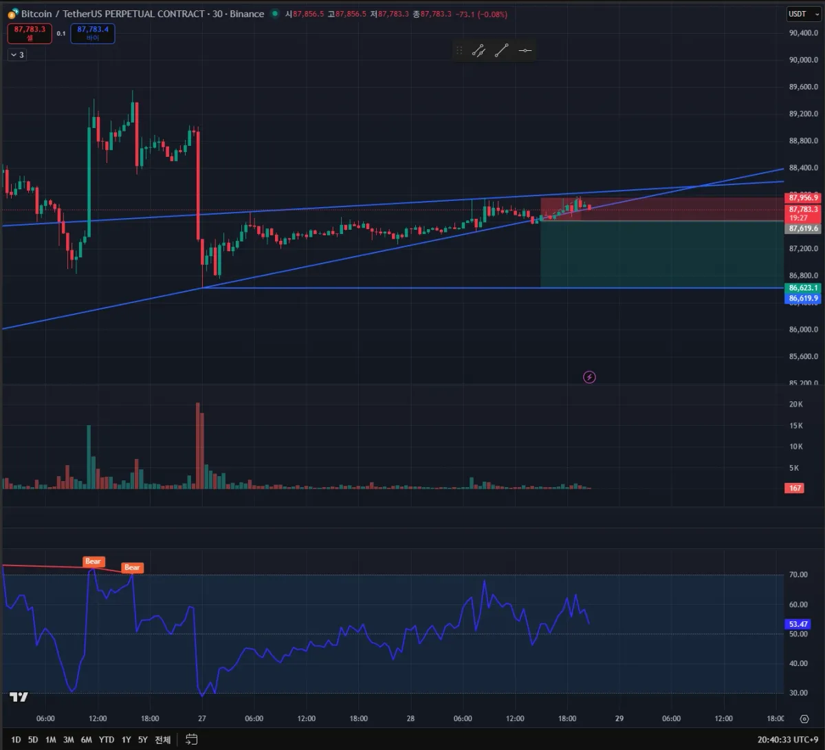 추세선 이탈 후 저항선(직전 추세선) 리테스트 한걸 확인하고 숏 포지션 오픈(목표가 : 직전 저점, 손절가 : 직전 고점(28일 08:30))