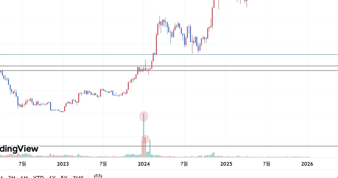 거래량 기준, 지지, 저항선과 매물대 표시해 봤습니다.