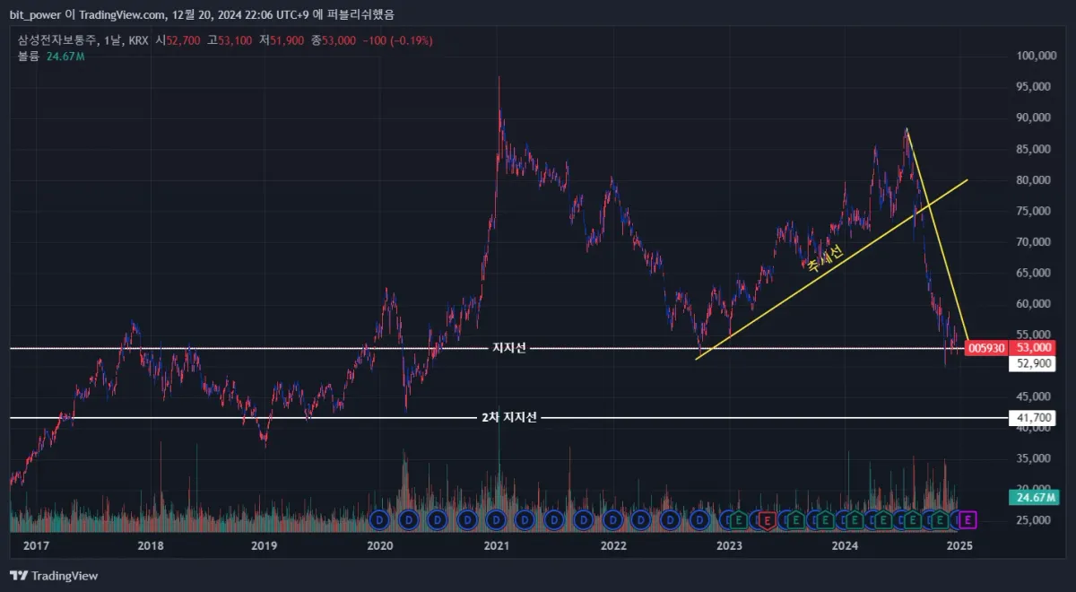 상승하던 추세가 하락 추세로 전환되었고, 1차 지지선에 닿아 있습니다. 1차 지지선에서 반등한다면 상승 추세로 전환될 것 같으며, 반등하지 못한다면 당분간 하락 추세가 계속될 것 같습니다.