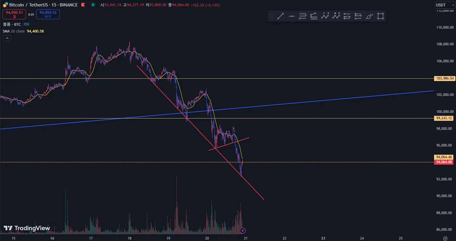 첫 번째 사진은 1시간 봉으로 파란색 추세선으로 상승추세를 유지하다가 12월 20일 02시 1시간봉에 추세선을 이탈하면서 추세전환이 시작되었습니다