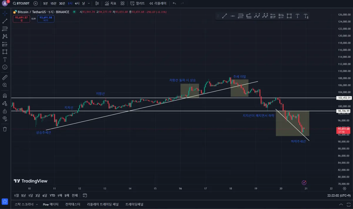 비트코인 1시간 봉 작도입니다. 캔들의 움직임을 보고 대략적으로 지지 저항, 추세 파악을 하여 작도를 하였습니다. 현재 지지선이 깨지면서 하락 추세로 전환되어서 가격은 떨어질 것으로 예측하고 있습니다. 지금은 작도를 할 때 어떤 캔들을 기준으로 할 것인지 판단이 되지 않아서 앞으로 많은 공부가 필요할 것 같습니다.