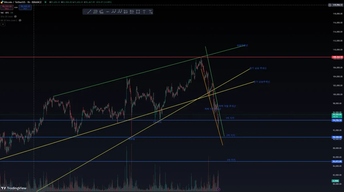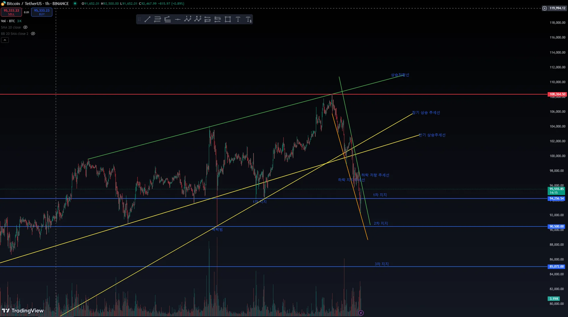 90k부근의 2차 저항이 뚫린다면 85k정도까지는 하방을 열어놓고 생각해야 할 것 같습니다.