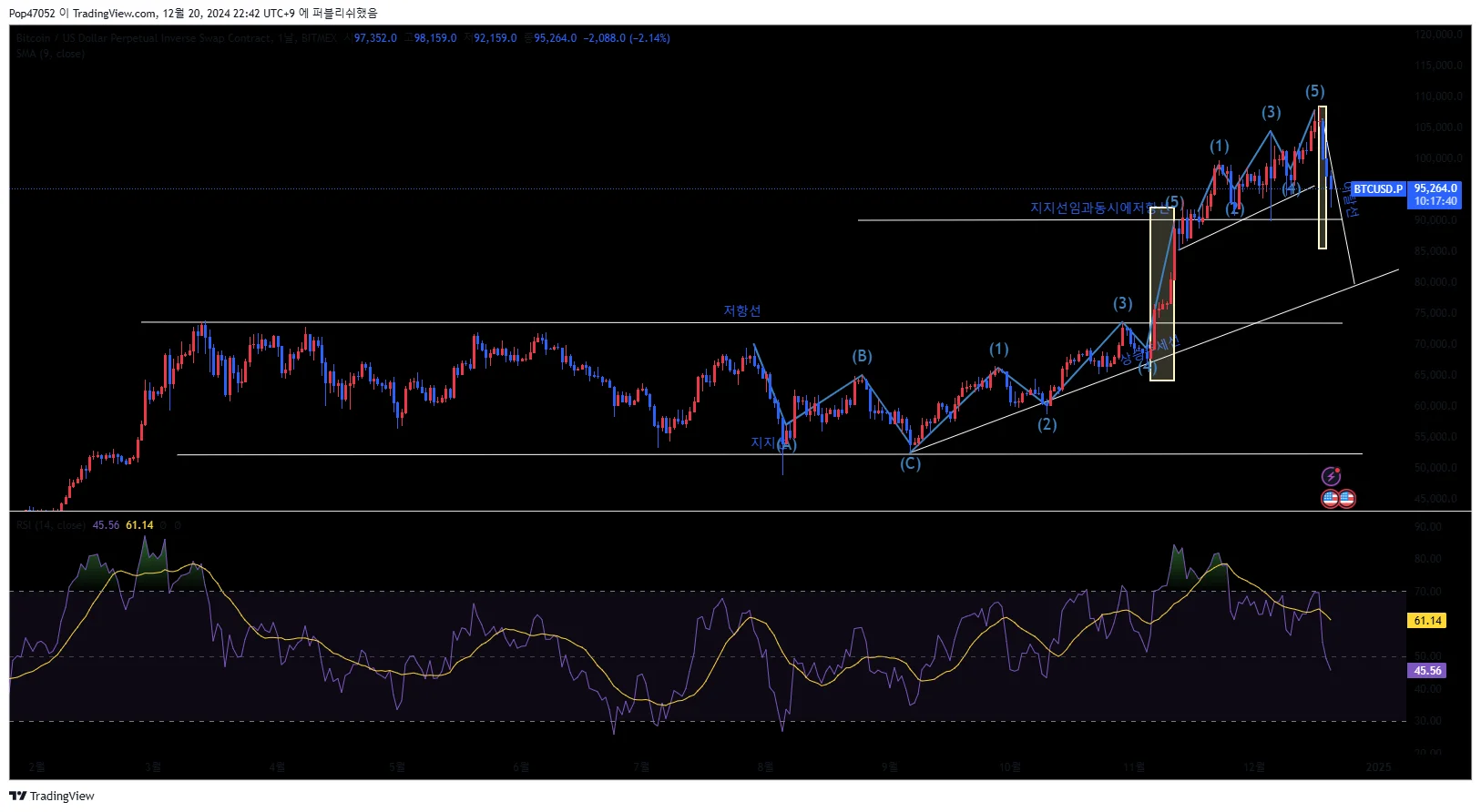 아래부터 상승추세선에서 2차 저항선에서 돌파후 지지하다 상승추세선을 나타내며 상승추세선이 꺽여서 하락하는 이탈선이 나옵니다