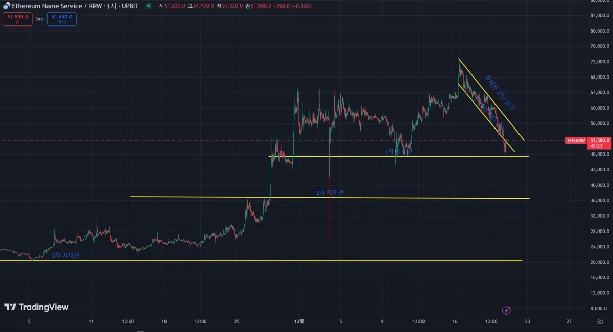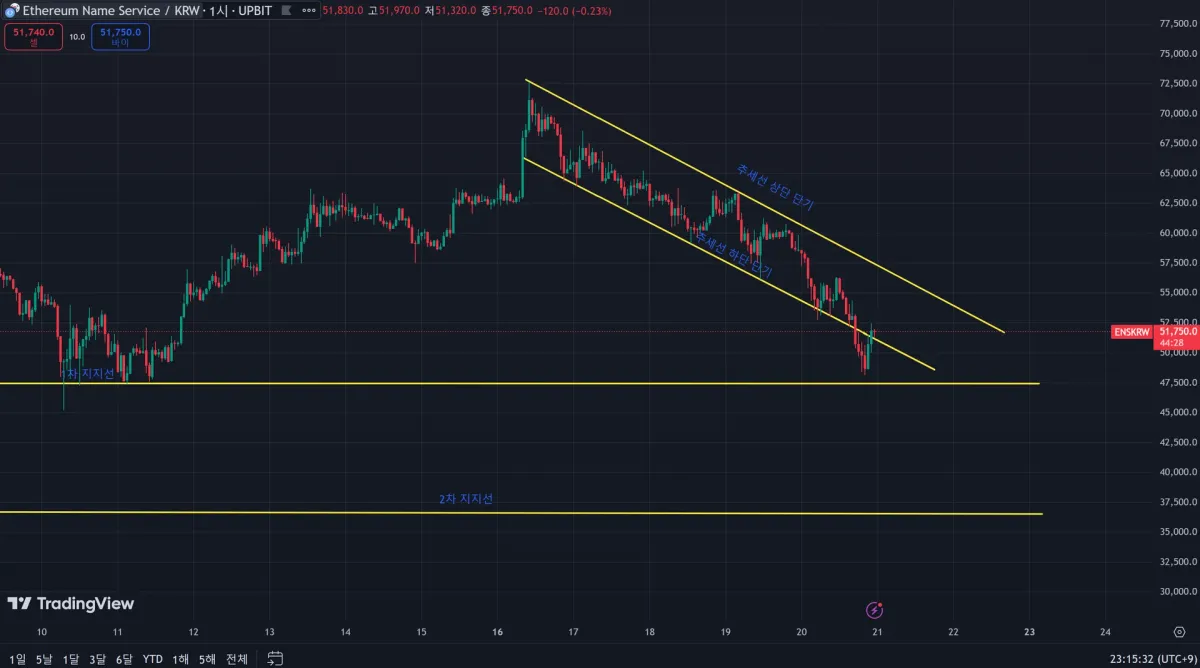 암 것도 모르도 뇌동매매하던 이더리움 네임서비스인데요. 1시간 봉인데 1차 지지선에 닿지는 않았지만 추세선 안쪽을 박스권처럼 횡보(여기서 횡보라고 써야하는지 모르겠습니다)하다가 1차 지지선에 닿을려고 하니 반등이 일어났고 이 글을 쓰는 내내 움직이고 있는 캔들은 아마 떨어진다면 48000 근처를 건드려주고 위로 올라가주지 않을까 싶어요.