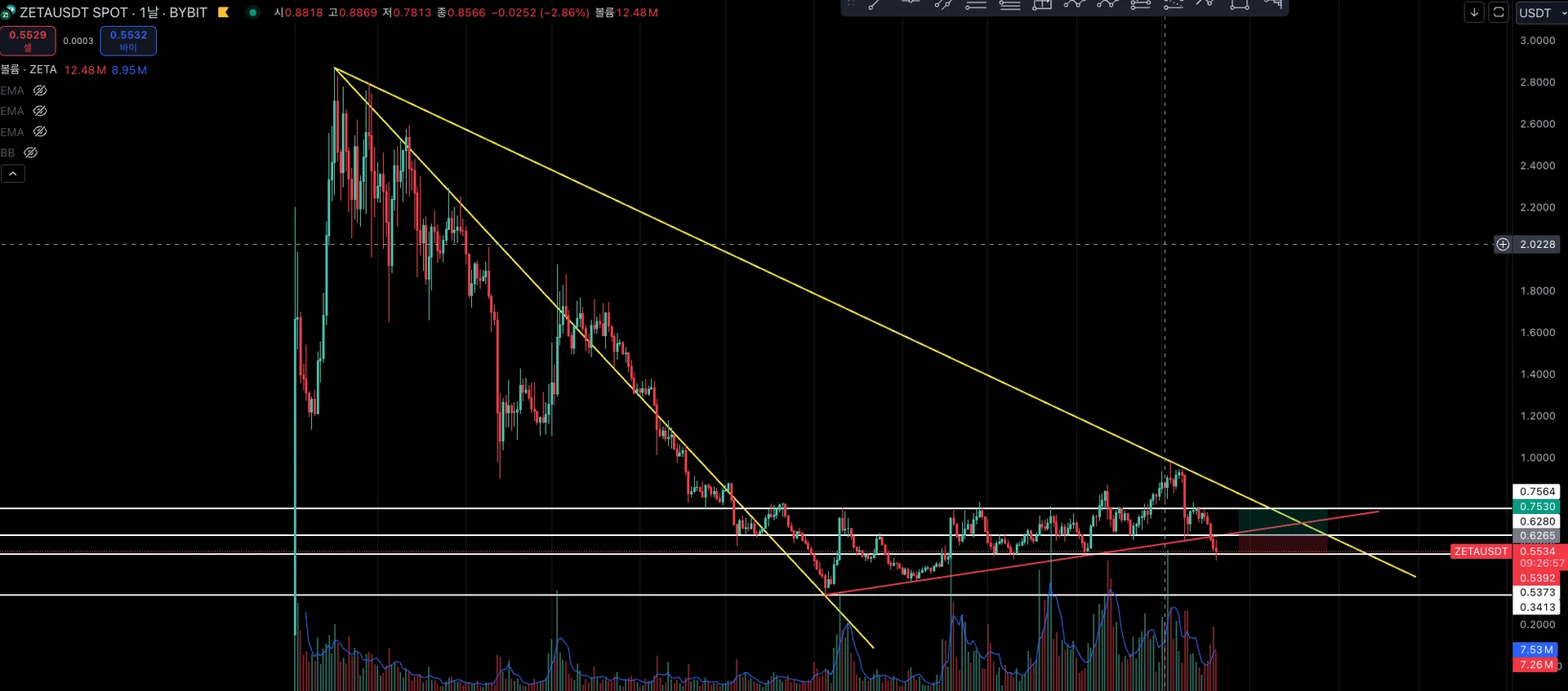 최고점으로 부터 최저점, 최근 고점을 노란선으로 작도한 추세선으로 봤을 때, 전체적으로 하락 추세이긴 하나 기울기가 완만해짐에 따라 국면의 변화가 이루어지고 있다고 생각했습니다.