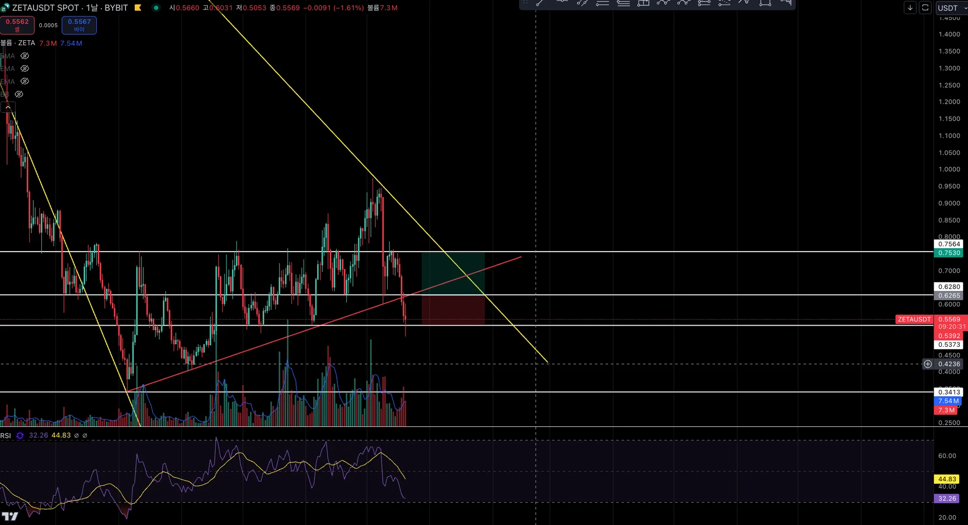 저는 RSI 기준 이전 동일한 지점 대비 하락한 것으로 보아 매도세가 강했던 것 같고, 곧 과매도 구간으로 진입할 것으로 보아 상승 전환을 기대하고 있습니다.