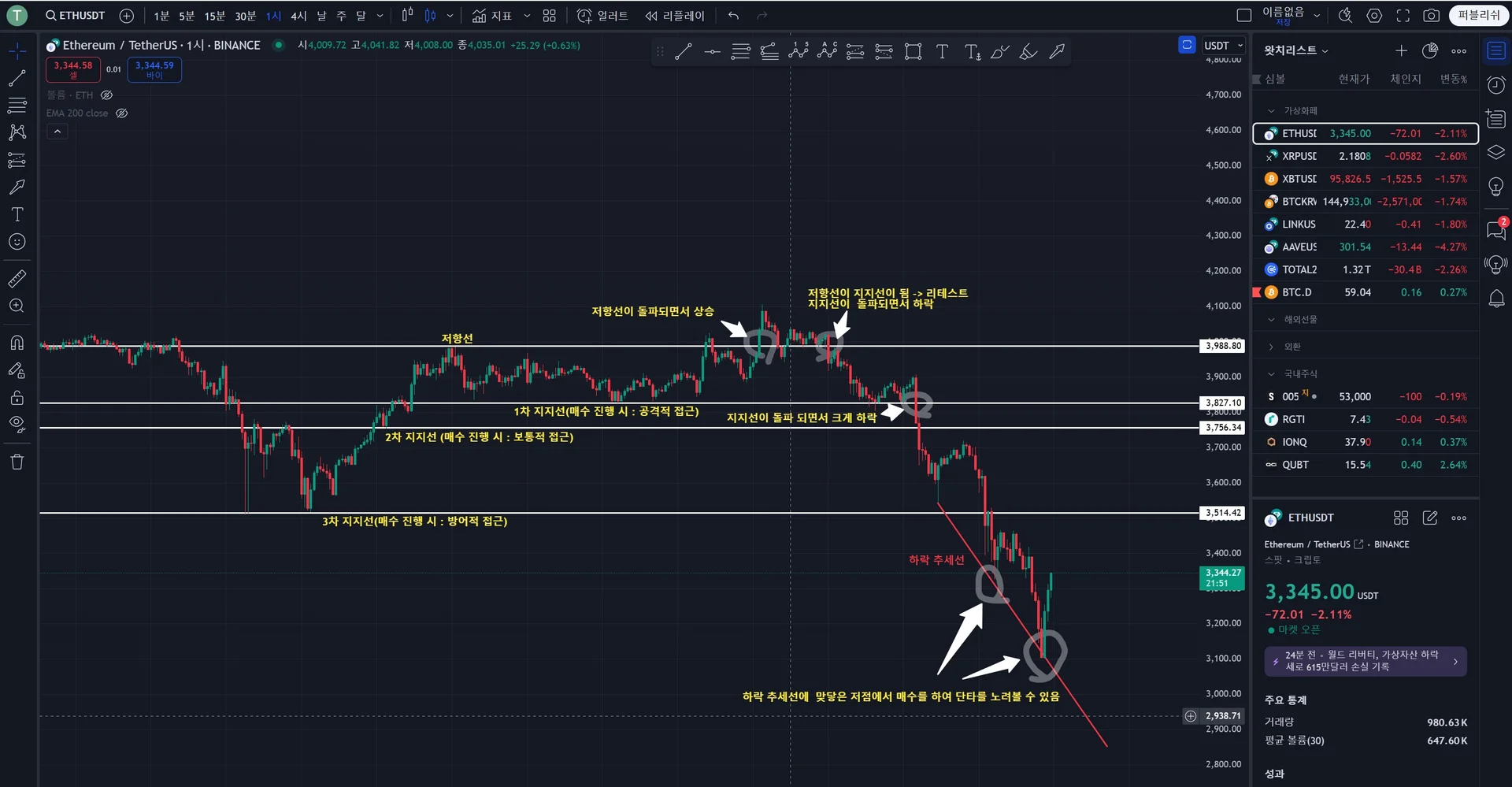 이더리움 1시간봉 차트를 기준으로 1차, 2차, 3차 지지선, 하락추세선까지 작도해보았습니다.