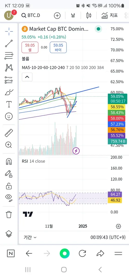 비트도미넌스의 상승추세선 리테스트에 닿을줄 몰랐는데 결국 닿네요ㅠㅠ 알트에게도 기회가되었으면좋겠습니다! 비트형은잠깐쉬어줘 ! 비트도미흡성과하락으로 알트폭락중 이동평균선 매입으로 용돈벌이 성공😢