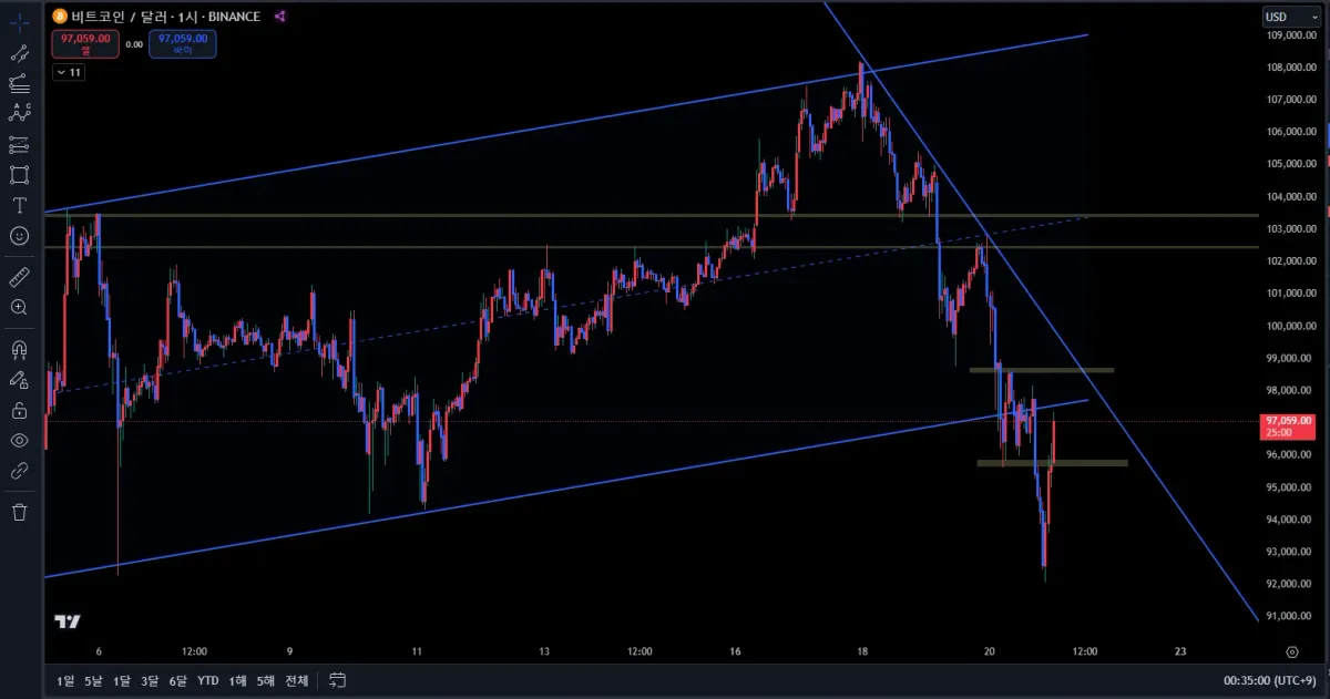 현재 비트코인은 1시간봉 채널하단을 이탈한 상태이고