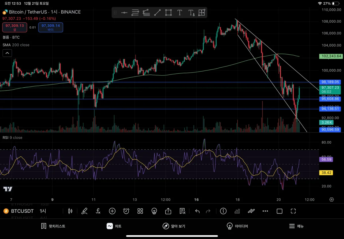 비트코인 1시간봉 차트입니다. 지지선과 저항선은 파란색, 하락 추세선은 흰색입니다