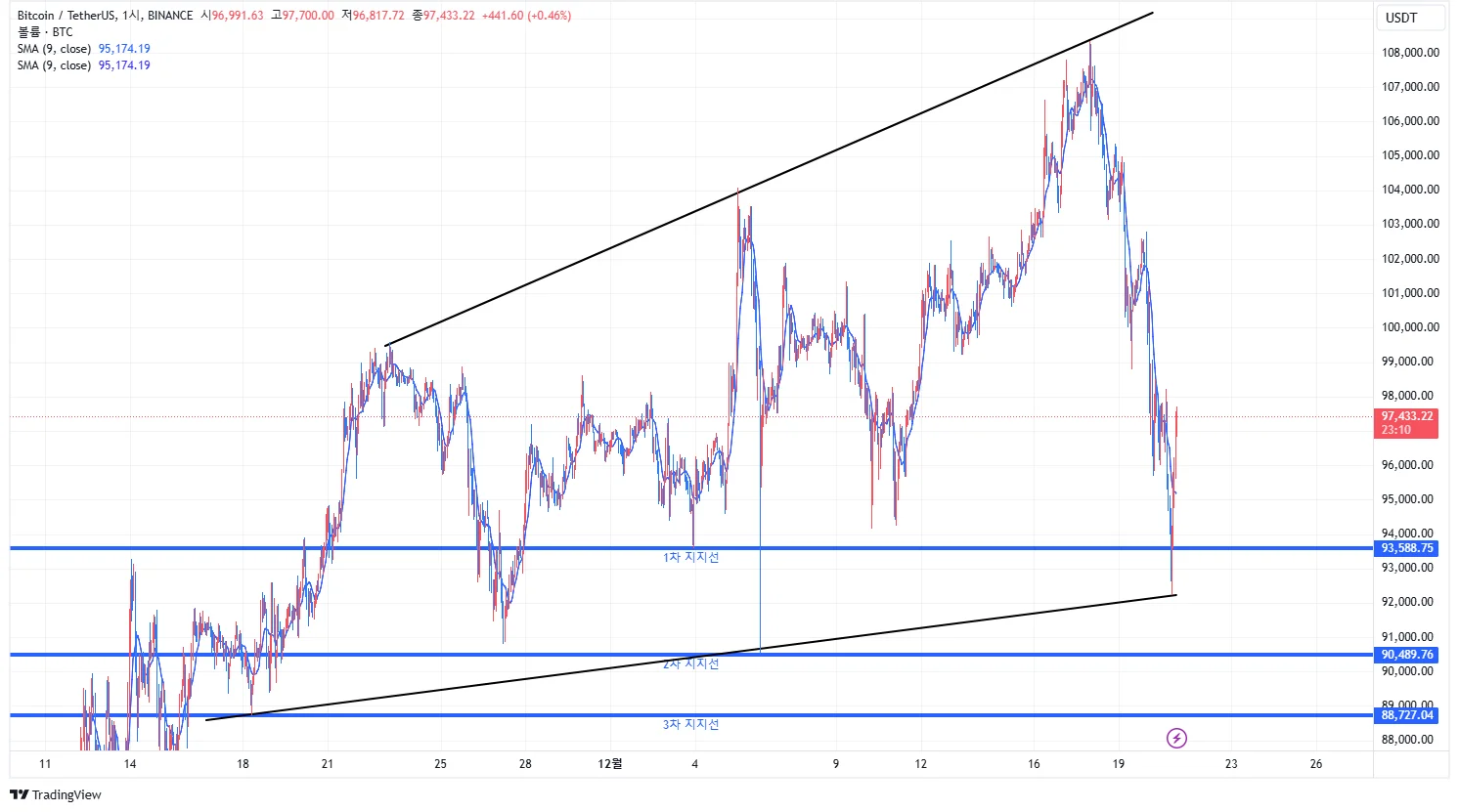 비트코인 1시간 봉으로 작도해보았습니다. 처음 해보는 거라 많이 어렵네요ㅜㅜ