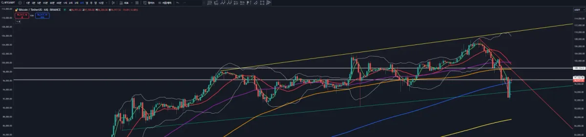 5일차 강의 듣고 비트 4시간봉 기준으로 지지,저항,추세 작도 하였습니다