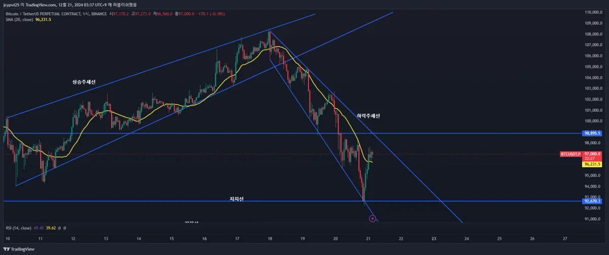 현재 비트코인 1시간봉으로 하락추세선을 따라 횡보하며 내려갈것으로 보고있습니다.