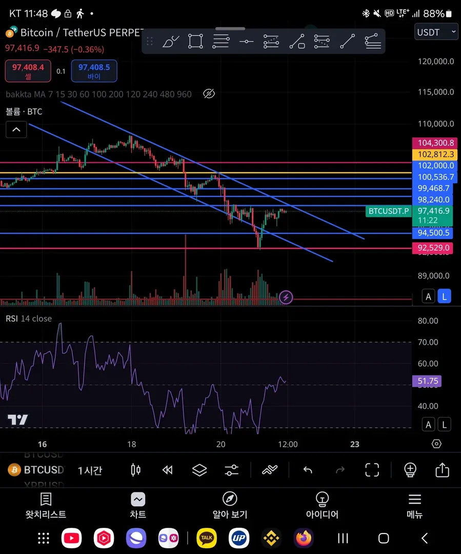 이를 토대로 추세선으로 그어보았는데, 1시간 봉을 기준으로 하락추세였다가 반등을 하였고 차트상으로 보면 역헤드엔숄더 패선 혹은 데칼코마니 패턴을 예상할수 있습니다. 102000까지 도달해서 저항선을 뚫는다면 그 위호는 더 상방을 향할것이라고 생각됩니다. 우리가 바라던 산타랠리를 볼수도 있겠습니다.