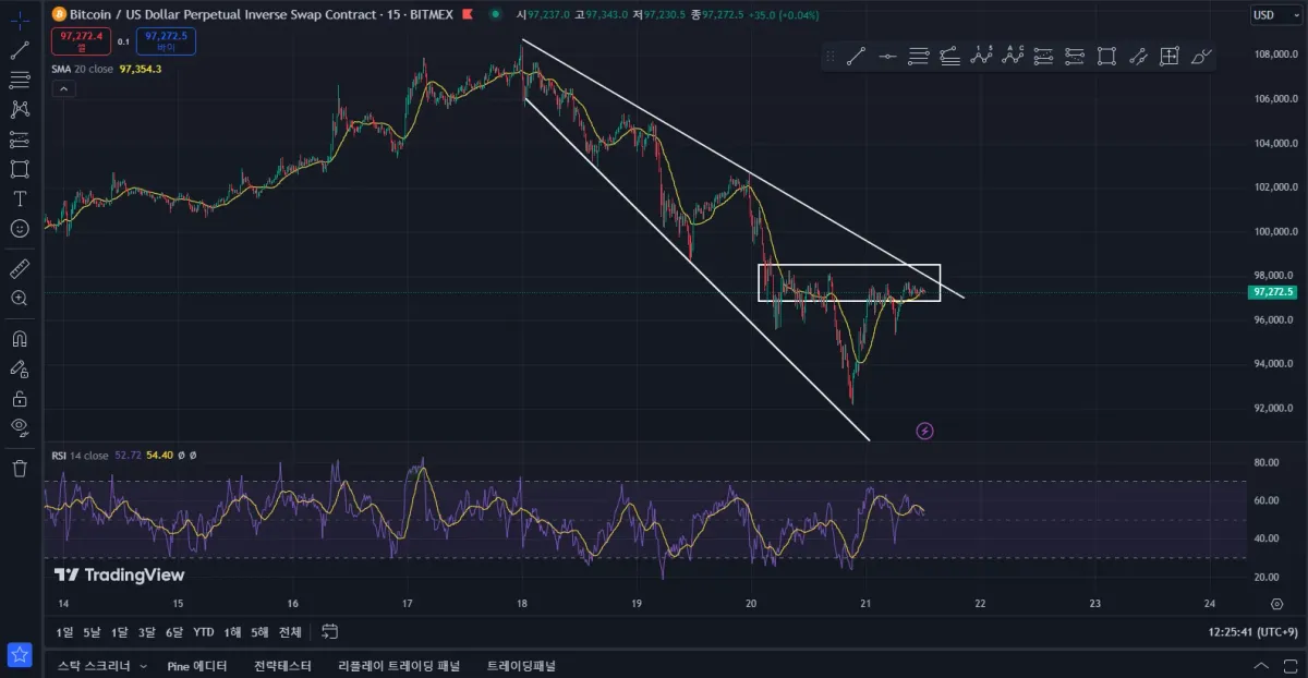 비트코인 15분봉 차트입니다. 현재 하락 추세에 있으며 97K에서 매물대가 확인됩니다.