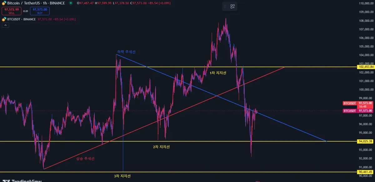 하락 추세선: 3차지지선 전 급격한 반등이 있는 고점을 시작점으로 연결하였습니다.