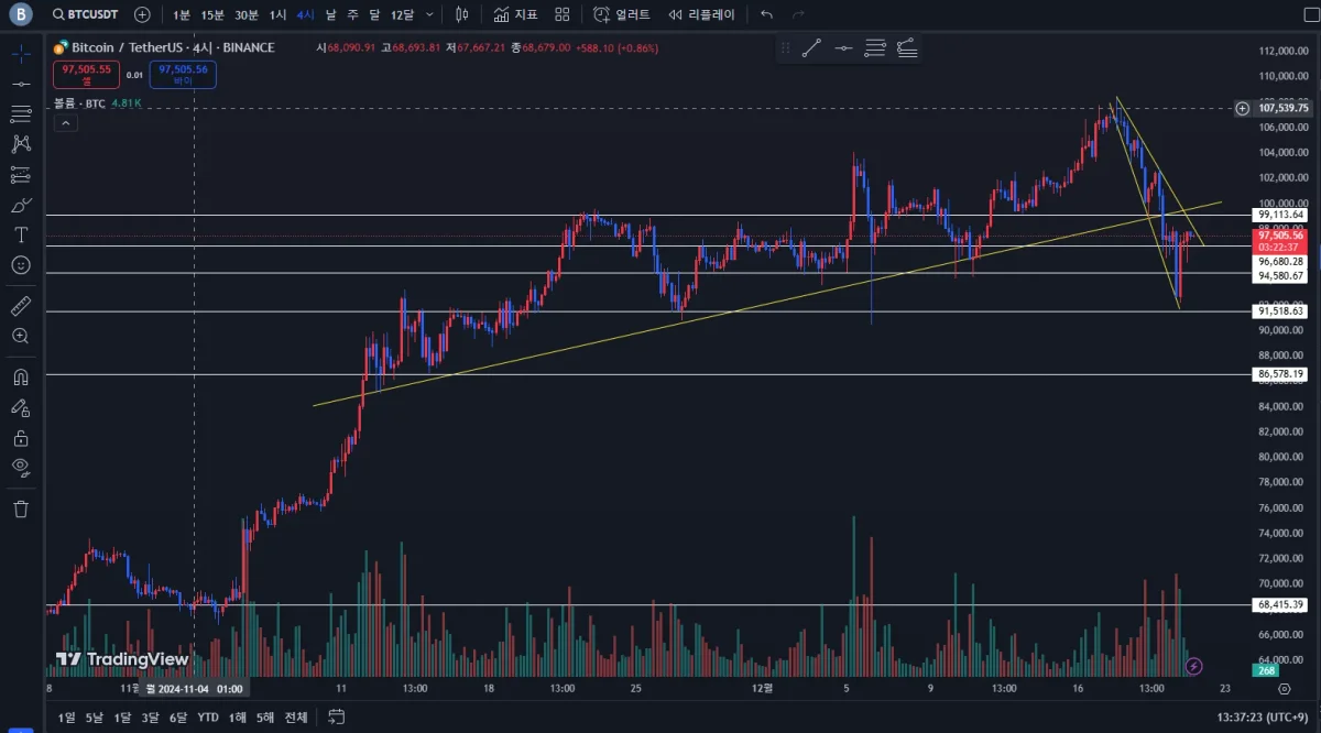 간단하게 비트코인 4시간봉을 기준으로 강의 들은 내용을 바탕으로 지지선과 추세선을 작도해 봤습니다.