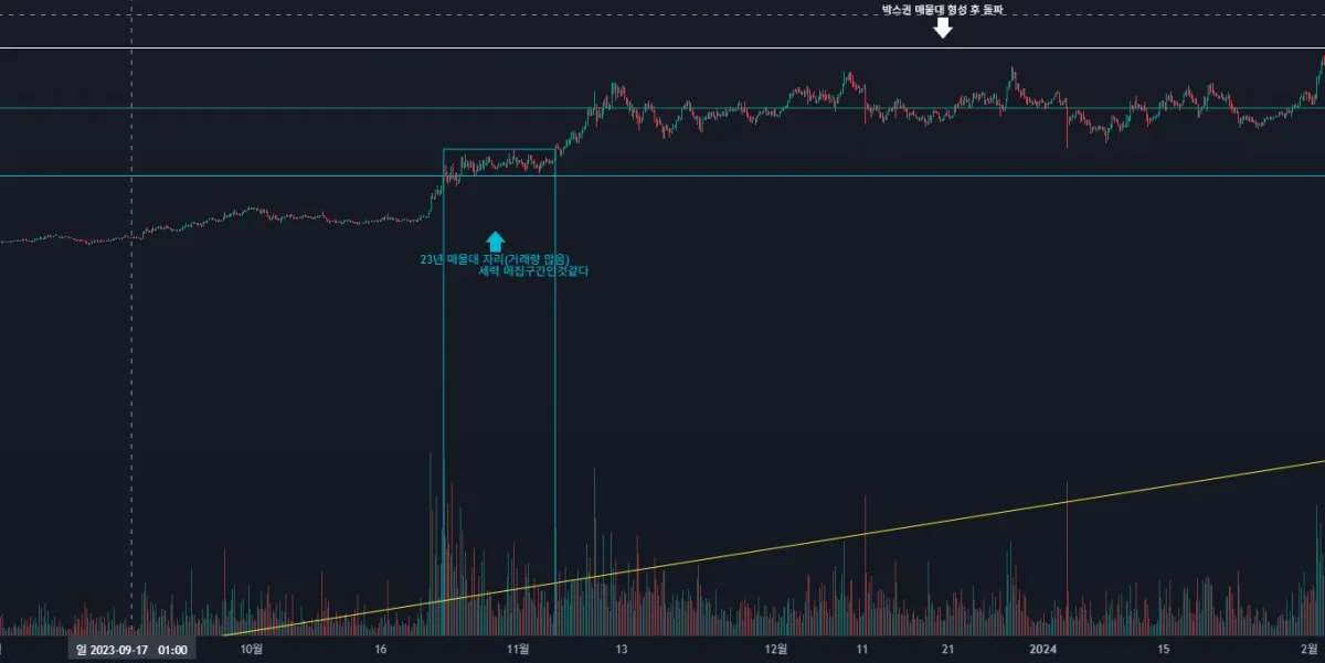 두 번째는, 밑에 사진처럼 거래량이 폭발하지만 박스권 횡보를 하는 구간은 매집을 들어가야 하는 구간인지도 궁금합니다!