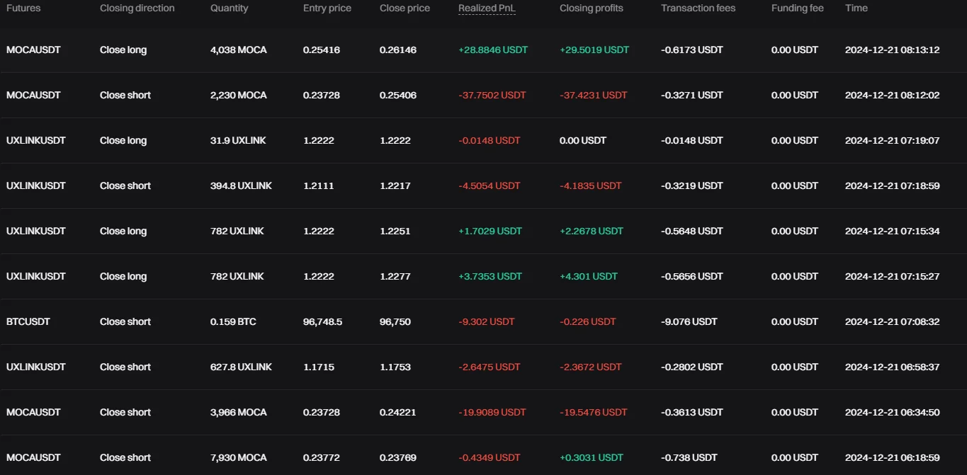 저의 경우 어제부터 딱 두 종목만 정해놓고 매매했으며 상승률 높은 moca와 변동성 높고 상승후 하락 중이던 uxlink를 매매했습니다