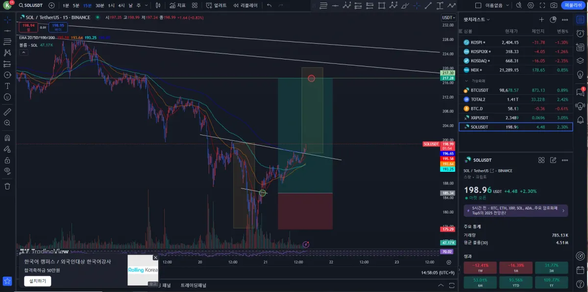 진입 이유는 아래와 같습니다. 1. 더블 바텀 패턴으로 보였습니다 2. 금리, FOMC, 셧다운 등 주요 악재가 해소되었다고 생각했습니다 3. 큰 추세에서는 여전히 상승 흐름이 유효하다고 생각했습니다 4. 역 해드엔 숄더 패턴도 보이는것 같아, 추가 상승 가능성을 기대했습니다 따라서, 다음 저항대 근처를 목표가로 설정했습니다.