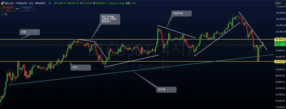 강사님이 설명주실때 쉬웠는데...이거..쉬운게 아니네요?^^;;; 여러번 그어봐야 할것 같습니다 저는 비트코인 4시간으로 해서 4시간 추세 그리고 4시간 안에 작은추세 . 지지.저항 그어보았습니다