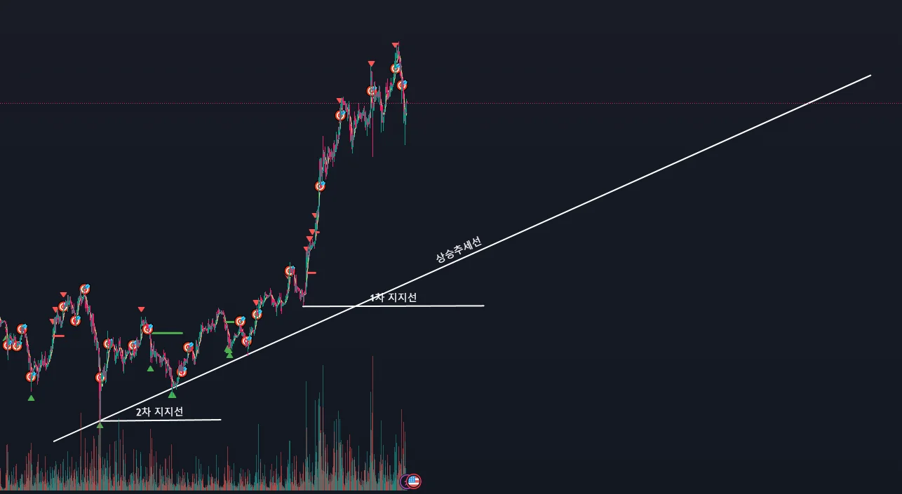 그리고 상승추세선을 그었고 현제는 고점찍고 하락추세가 보이지않아서 그리진 않았습니다.