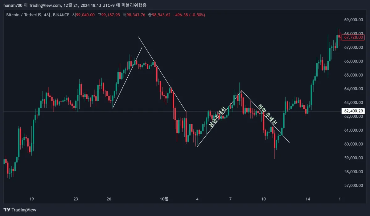 따라서 하락추세선은 하락캔들중 윗꼬리가 긴거끼리 연결하는걸로 이해해 그었습니다