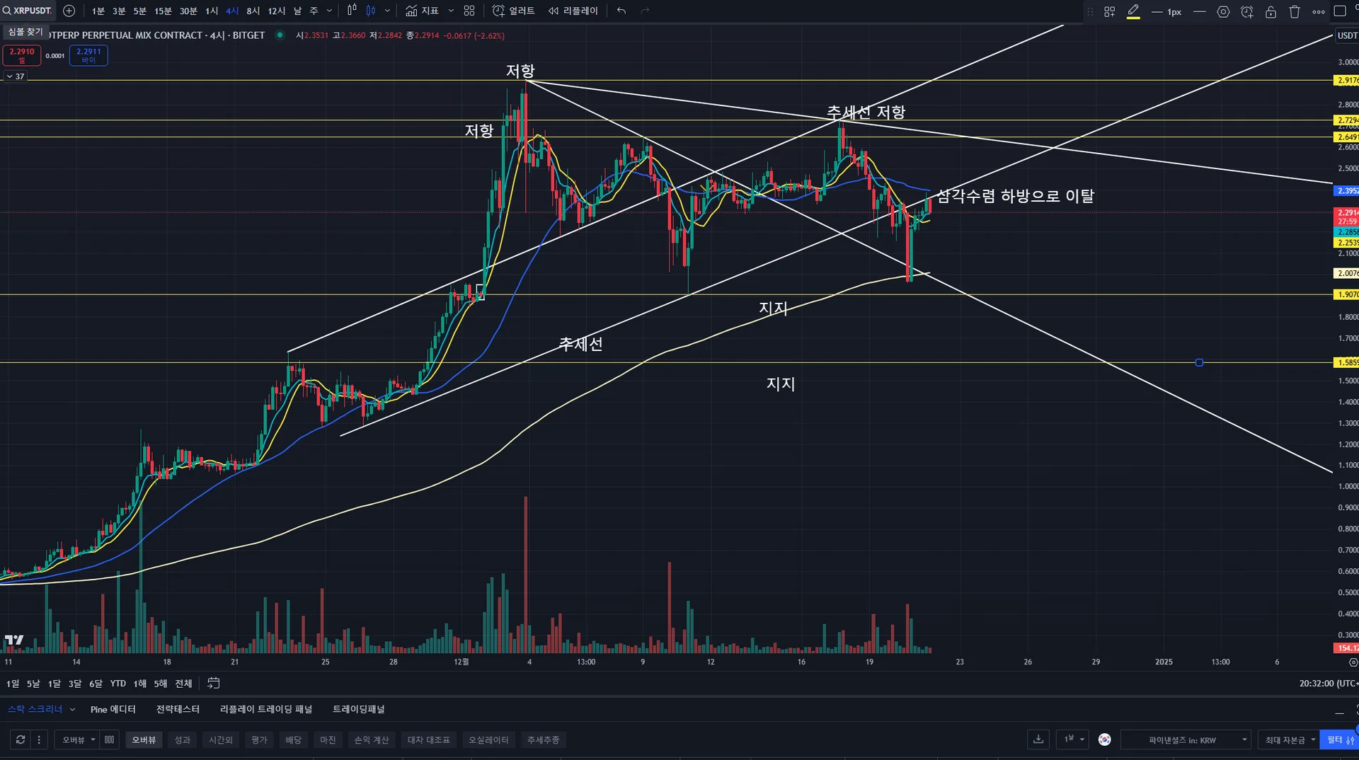 추세선을 추세선을 넘지못하고 음봉이나왓습니다 다시상승으로 가기위해선 삼각수렴안으로 올라타고 지지해줘야 다시 올라갈것같습니다