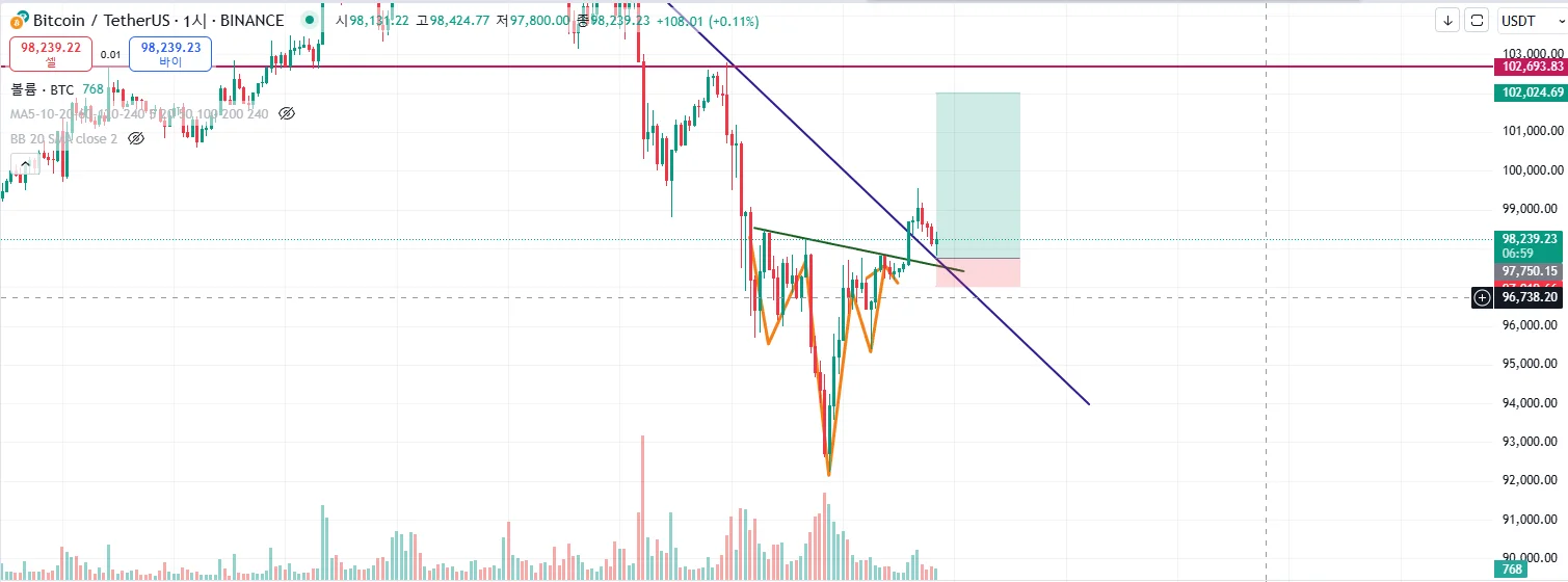 - 역 헤드앤 숄더 넥라인과 하락 추세선 밑으로 돌파할 시 97000