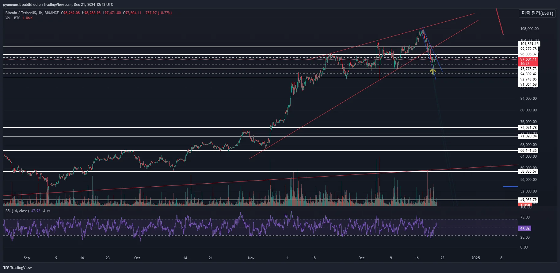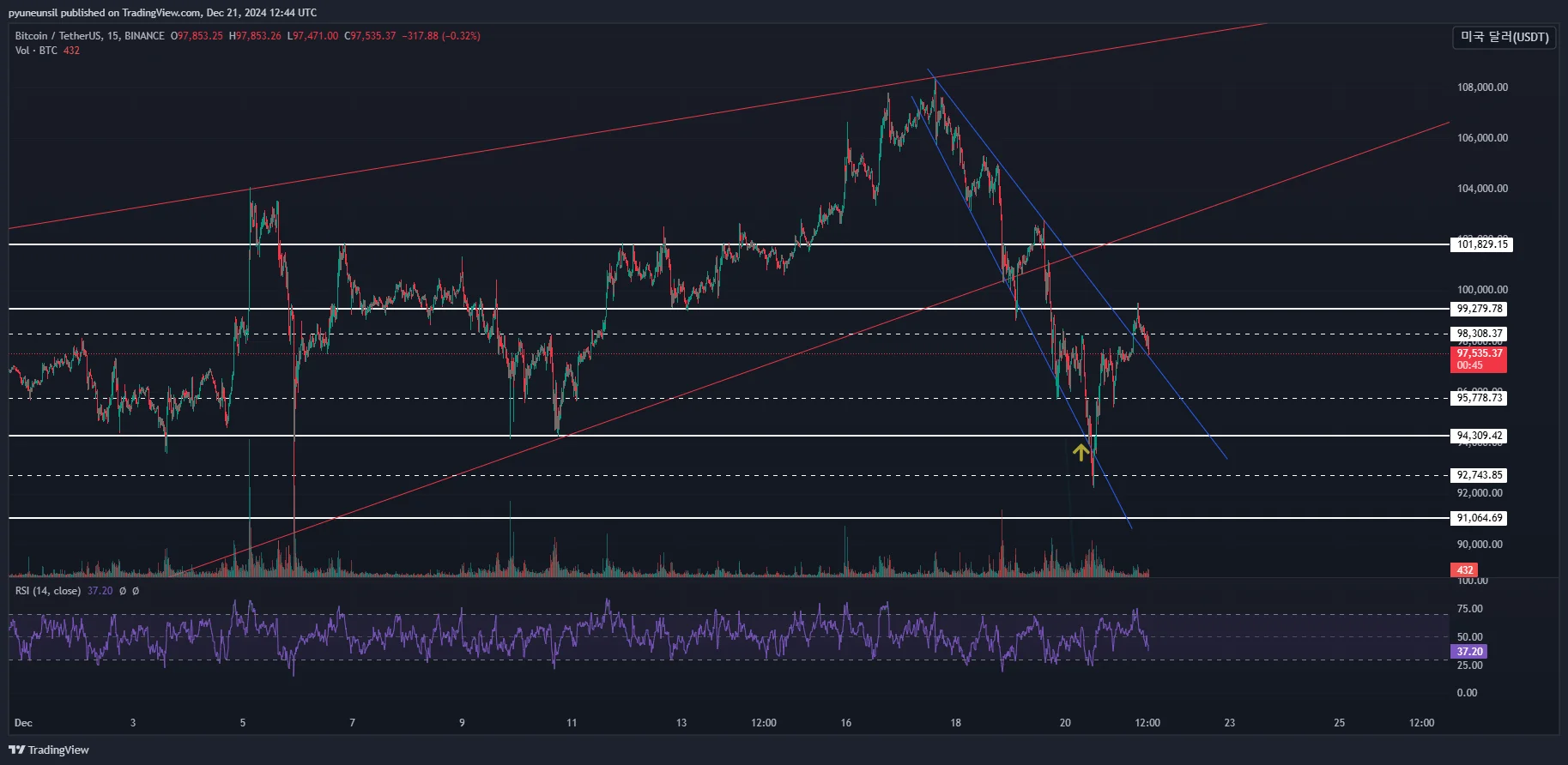 1.지지선과 하방추세선이 만나는부분(하방이 확장형 추세를 그리고 있다고 생각되었음)이라 하락이 끝나는 지점이라고 판단