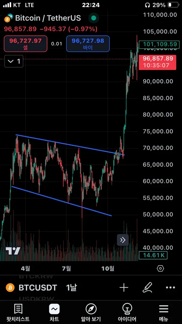 현재 PC를 사용하기 힘든 환경에 모바일로 작도를 하려다보니 많이 어려워서 너무 아쉽네요.. 우선 윗쪽 추세선은 유의미해보이는 저항선을 그어보았고 마찬가지로 아랫쪽에도 지지선을 그어보았습니다. 하락횡보를 하는것 같아보였는데 저항선을 돌파한 이후에 쭉 상승하는 모습을 확인할 수 있는 것 같습니다.