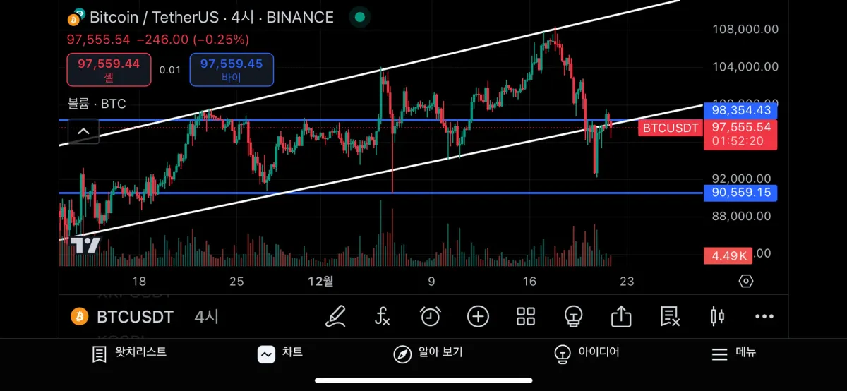 98000 에 지지라인과 추세선 바닥라인이 겹치는걸보니 중요하게 지지하줘야하는 자리로 보입니다