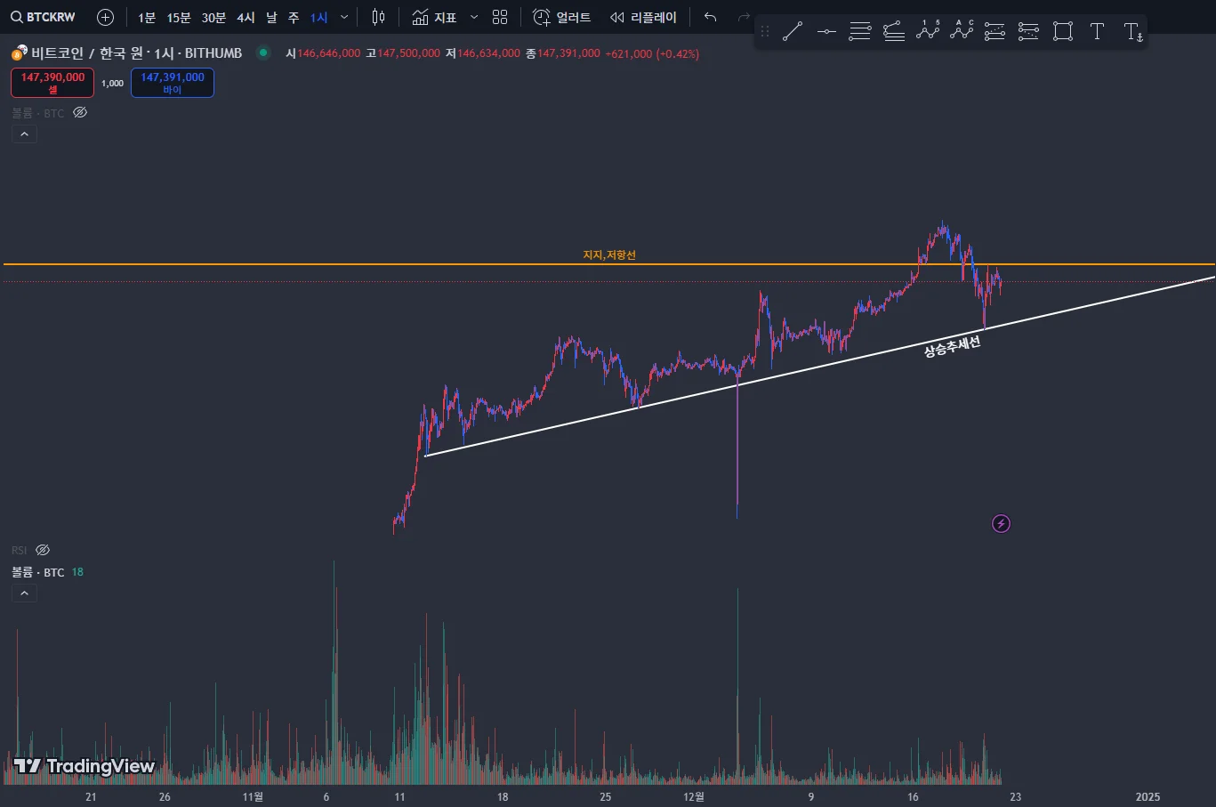 상승 추세선은 일봉으로 차트 보고 작도했고, 지지와 저항선은 1시간봉을 기준으로 거래량이 상대적으로 많고 위에 박스 구간이라 생각되는 위치에서 지지선을 찍고 올라가고 아래 박스 구간이라고 생각되는 곳에서 저항선을 찍고 다시 하락하는 곳을 생각해서 작도 해 보았습니다.