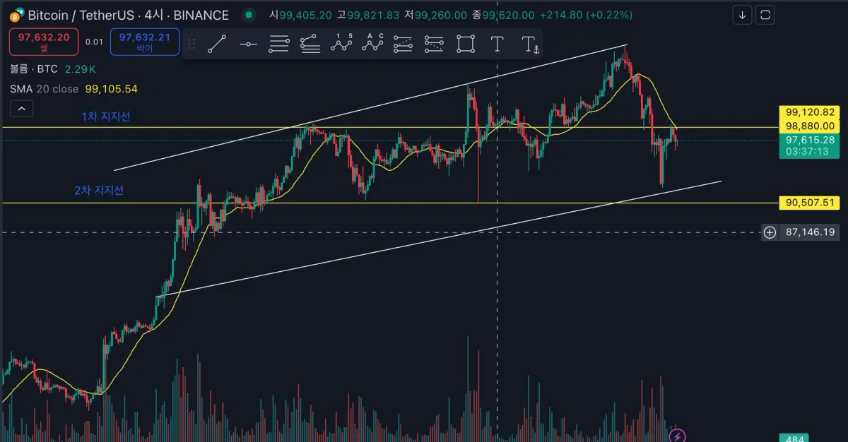 완전. 초보라 ㅠㅠ 제대로 이해하고 있는지 모르겠지만 지지선 과 상승 추세선을 그려서 한번 분석해봤습니다. 아직 상승 추세선을 깨고 있지않아서 당분간은 상승 추세라고 생각하지만 조정이 몇번 더 올것 같습니다.