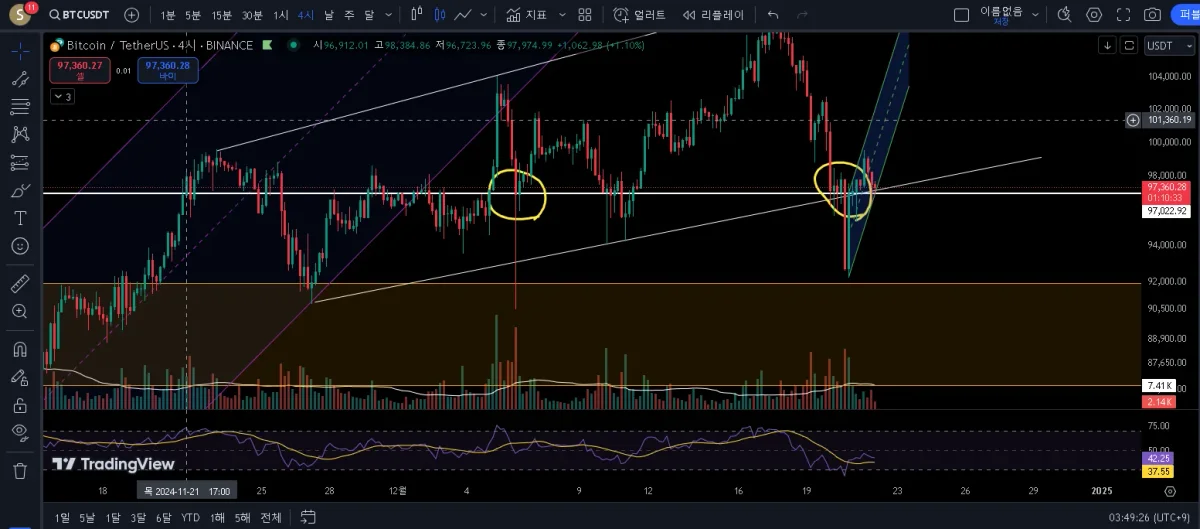 4시간봉 상승 추세선과 1시간봉 상승채널의 하단선과 만나는부분에서 롱포지션 진입했습니다. 채널 중간에서 1차 익절 상단에서 2차 익절 예정입니다.