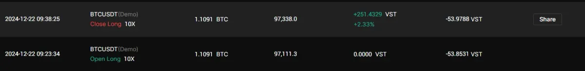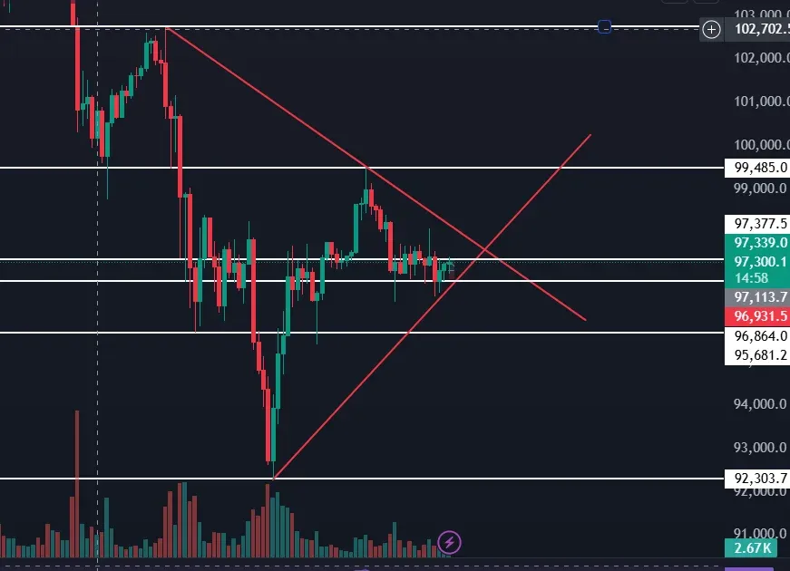 사진에 가격이 보이지 않은데 목표가 97337 손절가 96864을 두고 97113에 롱포지션 진입하였습니다.
