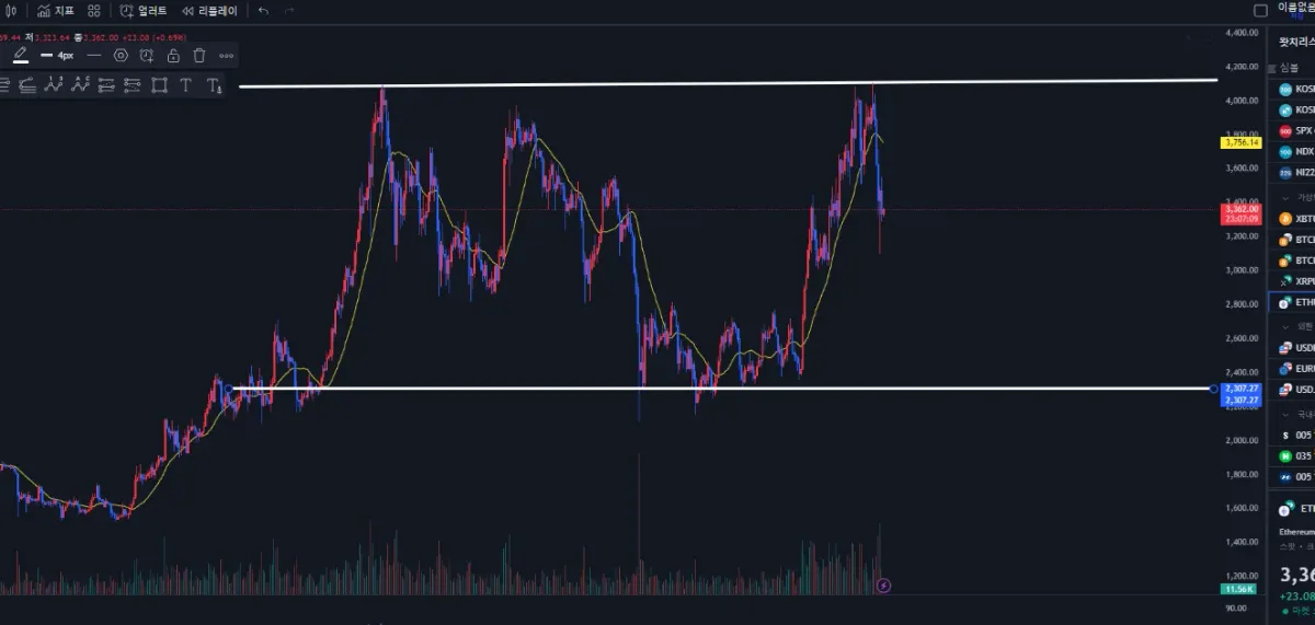 지지 저항, 추세파악을 통해 가격이 예측하는 방법 확인하기 미션 처음 작도 하는데 제가 보기에는 박스권에서 지금 횡보하고 있다고 생각합니다. 2300에서 지지하고 있고 4300에서 저항하고 있다고 생각합니다. 처음이라 아직 잘 못하지만 30일 동안 열심히 하겠습니다. 감사합니다.