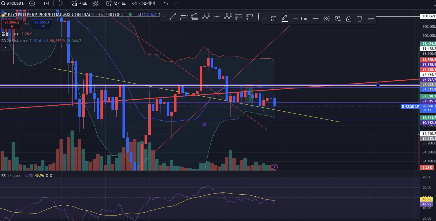 - 4시간 봉: 지지/저항 구간 97,010 (지지) / 97,900 (저항).