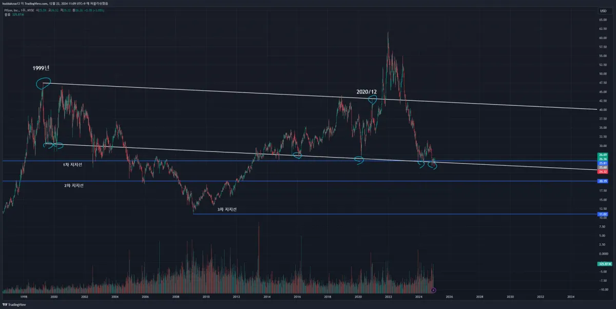 화이자 주식 그래프의 추세선과 지지선을 그려보았습니다.