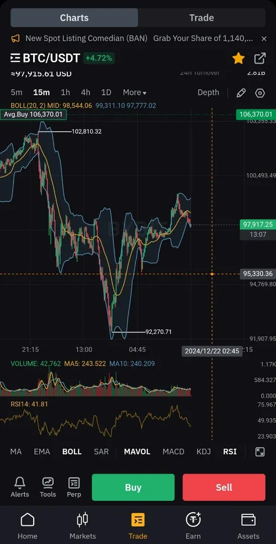 1. 15분봉 rsi가 30근처이며 볼린저밴드 하단에서 올라오려는 움직임이 느껴짐