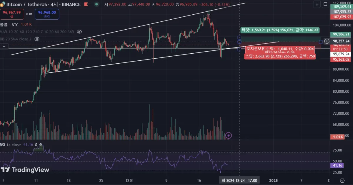 스탑로스는 제 생각에 지지대로 추정되는 95363 달러로 정했고 익절라인은 저항대로 추정되는 99586으로 설정했습니다.