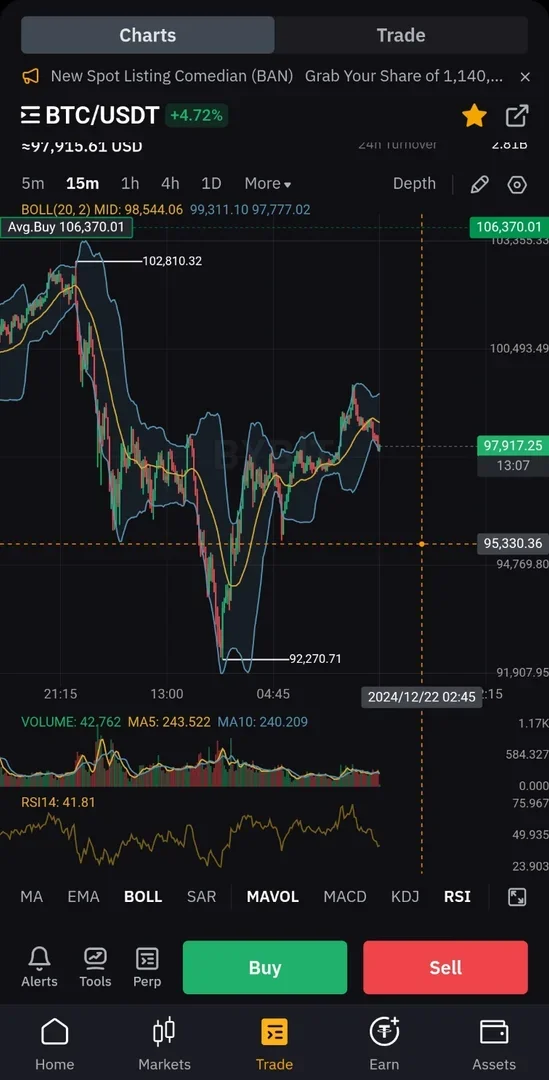 1. 15분봉 rsi가 30근처이며 볼린저밴드 하단에서 올라오려는 움직임이 느껴짐